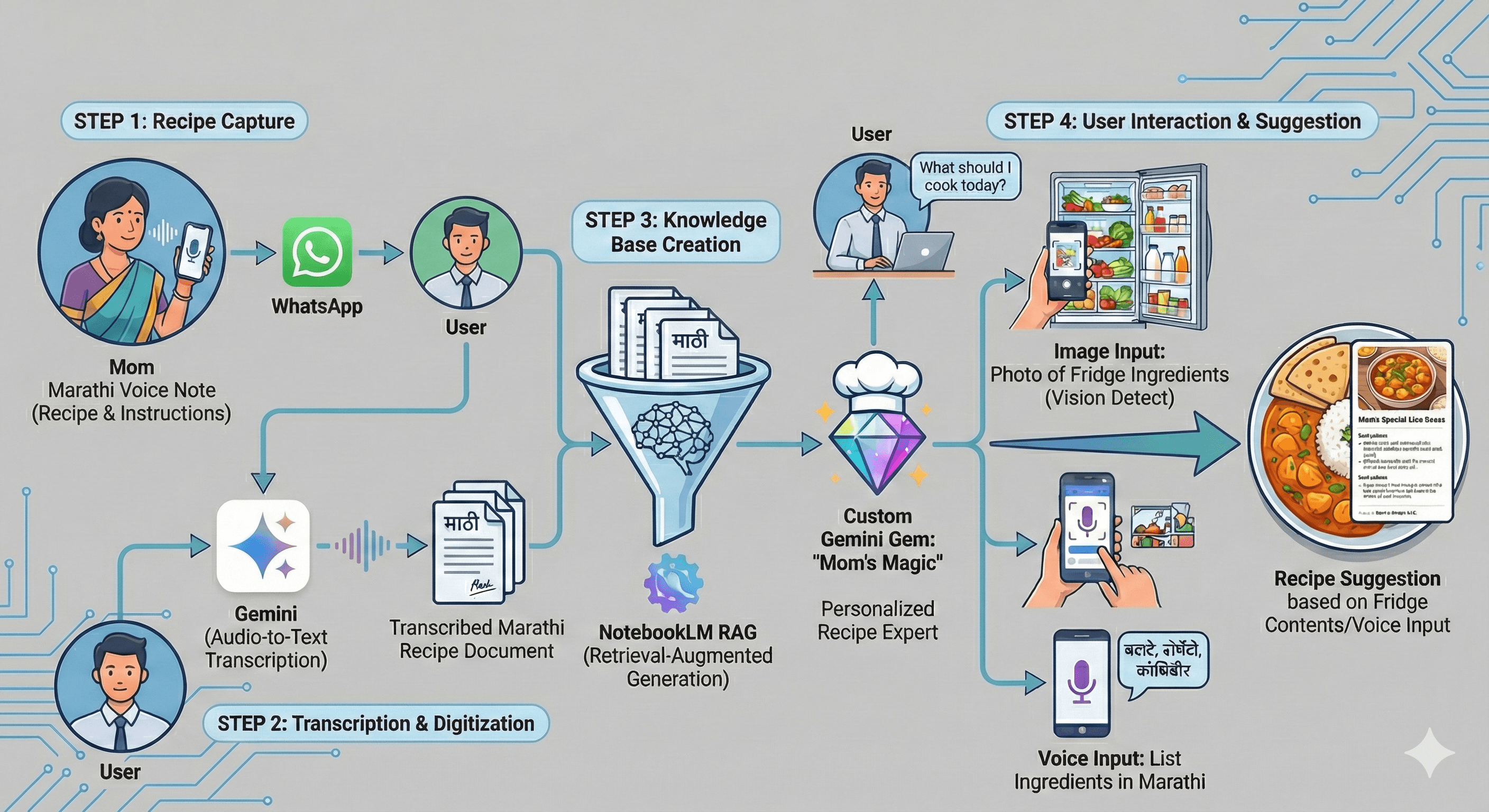 Mom’s Magic is a semi-automated AI workflow designed to digitize, organize, and activate a fragmented library of traditional Marathi recipes. By bridging the gap between raw voice data and actionable culinary insights, the system allows for real-time meal planning based on available ingredients, ensuring that the heritage of home-cooked food remains accessible even while living thousands of miles away.