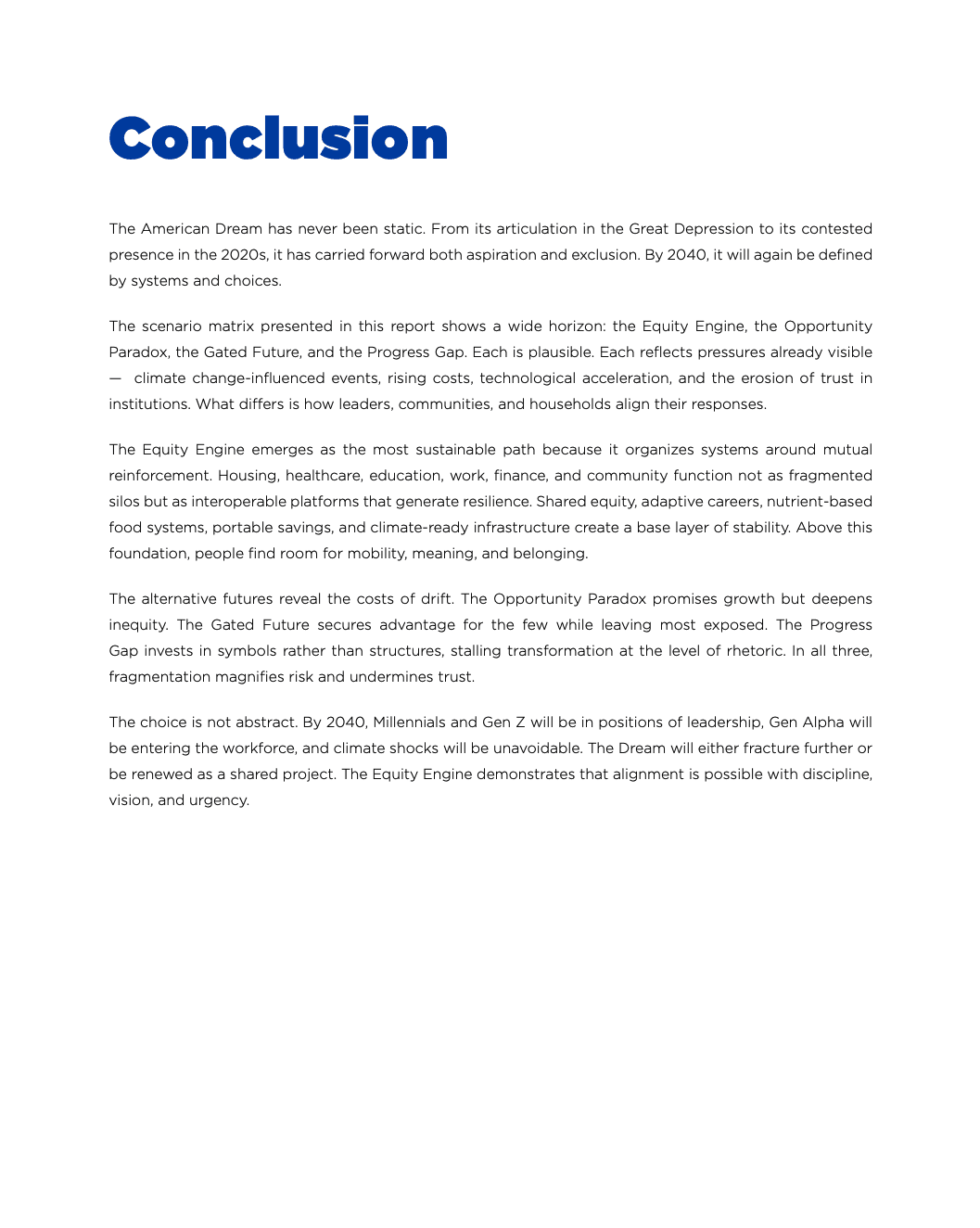 The study revealed a significant shift from a material-based definition of the American Dream to one centered on autonomy and holistic well-being. Key findings highlighted deep-seated anxieties regarding financial volatility and the rising cost of traditional milestones like homeownership and education. However, it also uncovered a resilient commitment to community and local agency. By identifying these "undercurrents," the research produced four distinct future scenarios, allowing stakeholders to visualize how different archetypes would navigate various socio-economic "Black Swan" events.